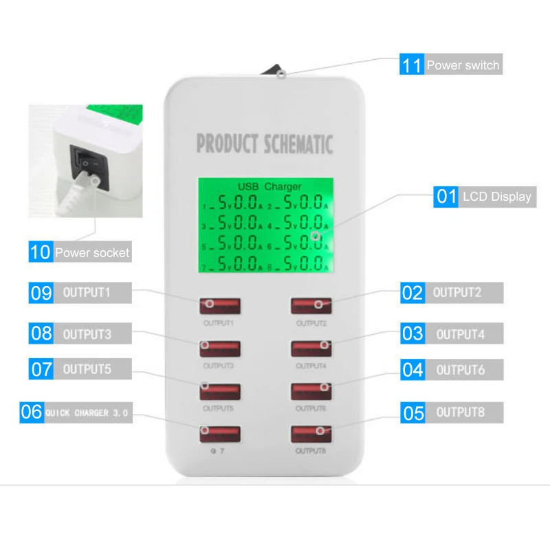 QC 3.0 USB Charger pd Ports Smart Charging Multi-Port Travel Charger LCD Digital Display Station Multi-Port USB Charging Plug US